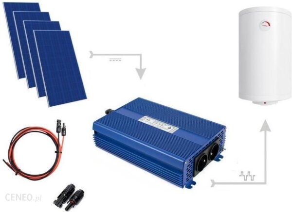 Najprostszy system grzania wody w bojlerach dostępny na rynku.Zestaw składa się z 4 paneli monokrystalicznych Kingdom Solar KD-M410H-108 Half Cell o mocy 410W każdy, przetwornicy ECO Solar Boost MPPT-3000 3kW oraz kompletnego okablowania o długości 25 metrów zakończonego z jednej strony złączami MC4 a z drugiej konektorami oczkowymi do przetwornicy.System jest prosty, wymaga jedynie podłączenia 4 sztuk typowych paneli fotowoltaicznych o napięciu roboczym około 32V lub odpowiedniej ilości innych, oraz odbiornika energii np. bojlera elektrycznego, ogrzewanie podłogowe.Prąd stały wytwarzany w panelach, którym nie można bezpośrednio zasilać urządzeń grzewczych, zostaje w przetwornicy zamieniony na prąd przemienny, którym można już zasilać urządzenia grzewcze.Maksymalna moc sytemu to 3kW, przetwornica posiada wyjście priorytetowe numer „1” oraz wyjście zależne numer „2”.Pozwala to na podłączenie dwóch urządzeń grzewczych np. dwóch bojlerów, z których jeden będzie nagrzewany jako pierwszy, a drugi w sytuacji gdy termostat tego pierwszego przerwie odbieranie energii z przetwornicy. Dzięki zaimplementowanej funkcji MPPT, przetwornica automatycznie przystosuje się domocy grzałki i tak ustawi swój punkt pracy, aby energia odbierana z systemu paneli fotowoltaicznych była maksymalna.UWAGA ! Urządzenia grzewcze z regulatorami elektronicznymi mogą być zasilane tylko z wyjścia numer 1.Zestaw zawiera:4 monokrystaliczne panele PV 410W Half CellPrzetwornica Solarna ECO Solar Boost MPPT-3000 3kWkomplet przewodów 25 metrów ze złączamiinstrukcję instalacjiDane techniczne:SOLARNA PRZETWORNICA NAPIĘCIA ECO Solar Boost MPPT-3000Napięcie wejściowe [VDC]: 120 do 350 (VDC)Napięcie wyjściowe [VAC]: 120 do 350 (VAC)Moc maksymalna: 3 kWFunkcja MPPT: TAKPołączenie paneli PV: szeregowe, lub szeregowo równoległePrzebieg napięcia na wyjściu: modyfikowany sinusWyjście VAC Nr 1: priorytetoweWyjście VAC Nr 2: Zależne *Zabezpieczenie pod/nadnapięciowe: TAKZabezpieczenie termiczne: TAKZabezpieczenie przeciążeniowe: TAKTemperatura pracy: -25°C ~ +55°CSprawność: 94%Chłodzenie: AktywneZłącze zasilania: MC4Gniazdo wyjściowe 230V: 2 x E (z bolcem)Obudowa: AluminiumStopień ochrony (IP): IP21Wymiary LxWxH [mm]: 290x190x80Waga [kg]: 2.4 kgPanel fotowoltaiczny Kingdom Solar KD-M410H-108 Half Cell 410W 10BB MonoMoc nominalna Pmax (W): 410Tolerancja mocy Pmax Maximum: 0 ~ +5Maksymalne napięcie Vmp [V]: 31.22Prąd w mocy nominalnej lmp [A]: 13.06Napięcie obwodu otwartego VOC [V]: 37.34Zabezpieczenie zwarciowe [A]: 25Prąd zwarciowy [A]: 13.7Wydajność modułu [%]: 20.97NOTC: 48°C (+-2)Współczynnik temperatury Pmax: -0.36%/CWspółczynnik temperatury Voc: -0.28%/CWspółczynnik temperatury Isc: +0.05%/CMaksymalne napięcie pracy: 1500VDCTemperatura robocza: -40°C +85°CMaksymalny prąd zwrotny [A]: 25Maks. obciążenie (śnieg/wiatr): 5400 Pa / 2400 PaOgniwa: Mono 182×182 mmIlość ogniw: 108 (54×2)Wymiary modułu [mm]: 1723×1133×35Waga [kg]: 21.5Szkło: 3.2mm szyba, szkło hartowaneSkrzynka przyłączeniowa: IP68 z 3 diodami bypassPrzewody: 4mm2, (+)120cm, (-)120cmKonektory: MC4-kompatybilne