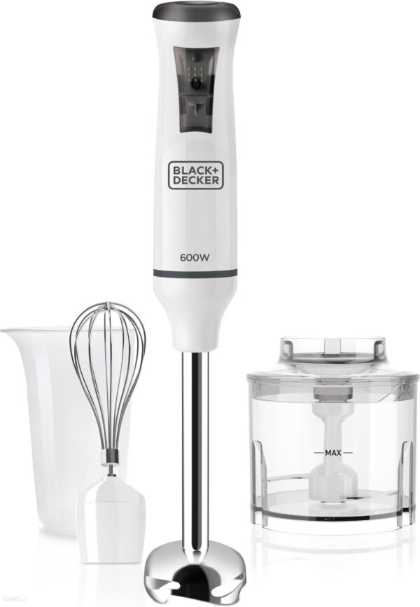 BLACK DECKER BXHBA600E blender ręczny 600WKod Produktu: ES9160070BEAN: 8432406160071Praktyczny, funkcjonalny mikser ręczny do wykonywania wszystkich rodzajów kremów, przecierów i produktów dla dzieci o gładkich, równych konsystencjach w bardzo krótkim czasie.Można mieszać, rozdrabniać, emulgować lub posiekać w celu przygotowania niezliczonych przepisów.Wybieraj spośród 20 zmiennych prędkości lub użyj funkcji turbo, aby uzyskać pożądaną teksturę.Posiada również osłonę zaprojektowaną, aby zapobiec rozpryskom.Moc 600 W i 20 zmiennych prędkości z funkcją Turbo do aktywacji maksymalnej mocy za naciśnięciem jednego przycisku.Produkt BPA FREE – wolny od bisfenolu. BPA – organiczny związek chemiczny z grupy fenoli, który jest często stosowany przy produkcji tworzyw sztucznych i może być przyczyną nieprawidłowego rozwoju dzieci, wad wrodzonych, nadpobudliwości, obniżenia płodności, otyłości oraz większego ryzyka wystąpienia chorób nowotworowych.Cechy produktu:600W20 poziomów prędkościFunkcja Turbo2 mocne ostrza ze stali nierdzewnejKonstrukcja Anty splashAkcesoria: pojemnik, rozdrabniacz, trzepaczkaŁatwy montażŁatwy do czyszczeniaStalowy mechanizm napędowy…