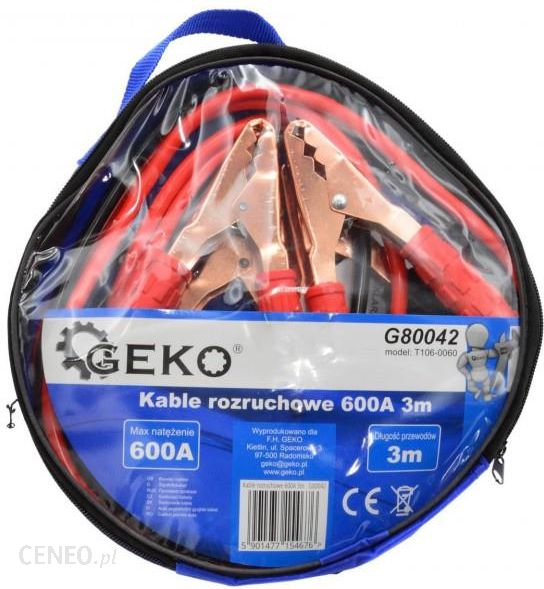 Kable rozruchowe pozwolą w szybki sposób uruchomić samochód z rozładowanym akumulatorem. Dzięki kablom Geko zaoszczędzisz czas i nerwy w chłodny poranek.Cechy produktu:długość 3 mmaksymalne natężenie 600 Apokrowiec do przechowywania w zestawie